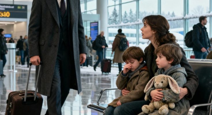 Edward turned reflexively. On a distant bench sat a young woman holding two children close. Their coats were too thin for the December chill that seeped through the terminal glass. One child — a boy — rubbed his sleepy eyes, while his twin sister clutched a stuffed rabbit, shivering.