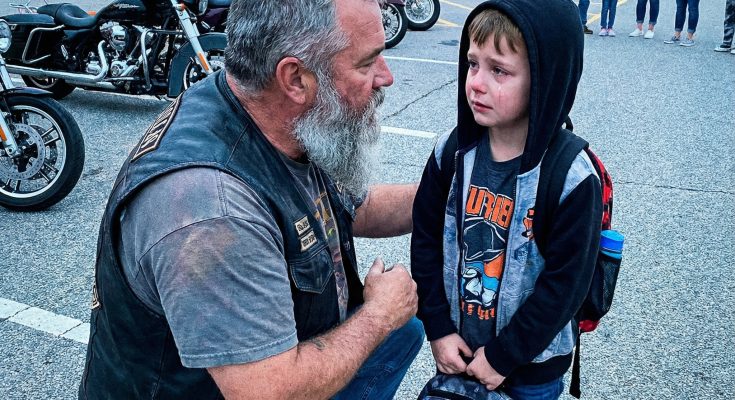 We walked through the school together. Forty-seven bikers surrounding one child. Hallways went silent. Teachers stepped out of classrooms. Kids froze.