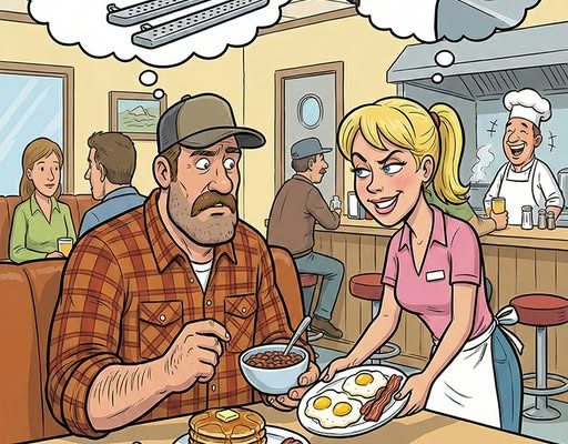 At the pass-through window, she leaned in and whispered to the cook, “There’s a guy out there ordering blowouts, high beams, and side steps. Are we… fixing his truck? Or feeding him?”