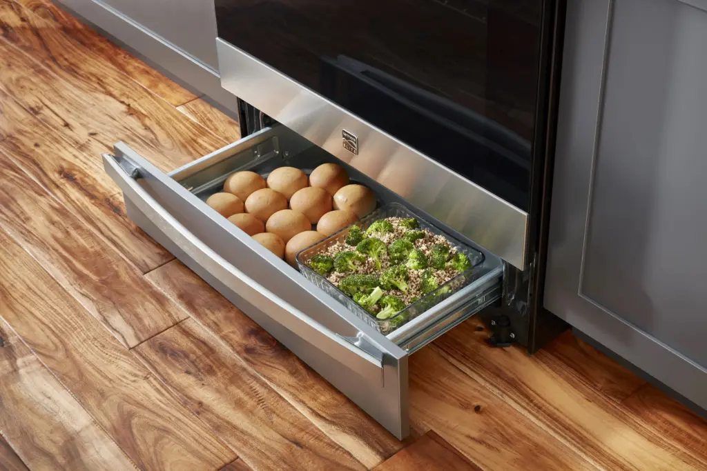 Some warming drawers may also include markings or settings such as “Warm” or “Proof,” indicating their intended use.