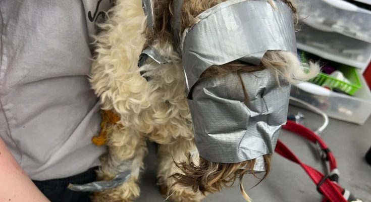 The dog was in an unbelievable condition: his head was entirely wrapped in duct tape, as was his tail, and his legs were taped together. He also reportedly had “food and other debris caked in his fur.”